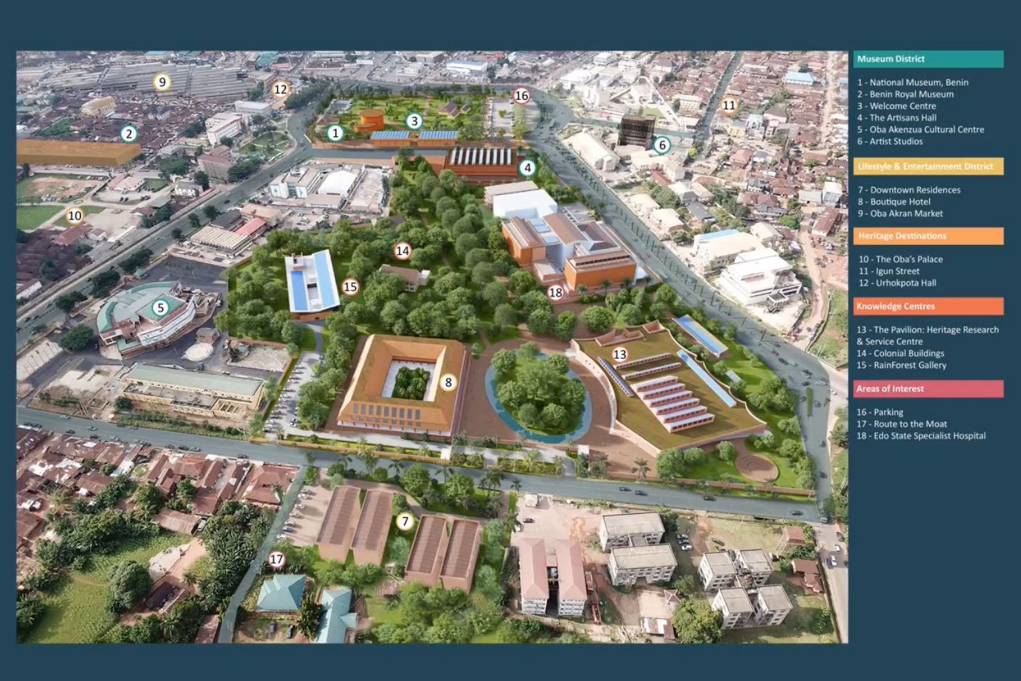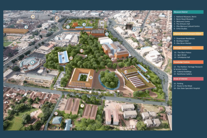 The original Benin Cultural District, as envisaged by the Obaseki administration — shared in a recent Facebook Live interview. #13 indicates what has now become MOWAA, while #2 is the designated site of the BRM