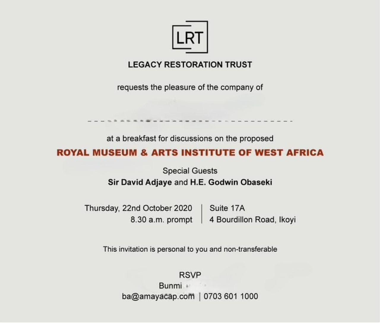 A fundraising card from 2020 from LRT inviting people to discuss the proposed Royal Museum, with Adjaye and Obaseki as guests.